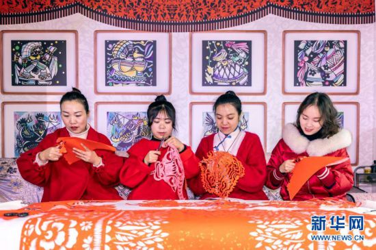 1月17日,岳红霞(右二)带领工作室学员创作“金牛送福”剪纸。新华社发(范晖 摄......