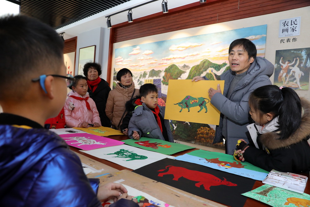 当日,诸暨市陶朱街道三都小学美术社团的学生来到三都农民画馆,在当地农民画家的指导下参观农民画展,了解农民画的特点,并学习用农民画的技法画生肖牛。新华社发(郭斌 摄)