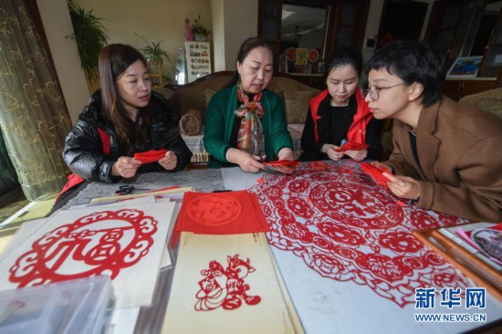 1月21日,中泰街道的党员志愿者正在跟着剪纸老师杨列平(左二)一起学习剪窗花,准备把窗花送到村社的百姓家中。新华社记者 徐昱 摄