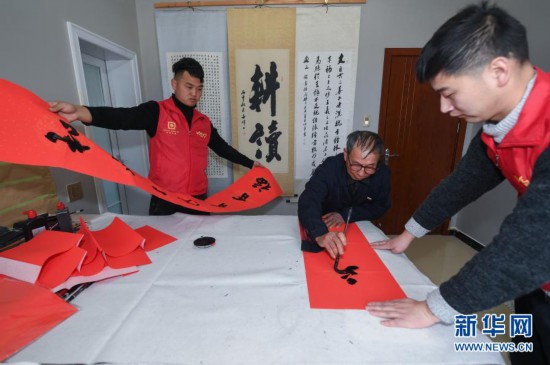 1月21日,中泰街道岑岭村的党员志愿者和当地乡贤沈炳华(中)在书写赠送村民的新春对联。新华社记者 徐昱 摄