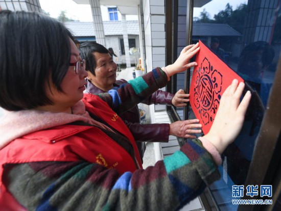 1月21日,中泰街道岑岭村的党员志愿者把窗花送到村里百姓家中。新华社记者 徐昱 摄