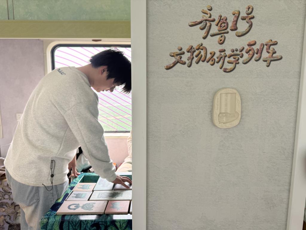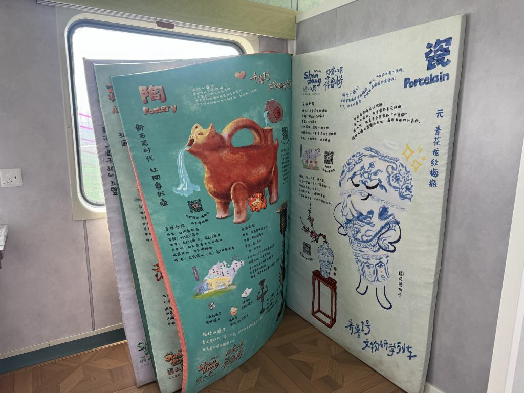 “好客山东·齐鲁1号”文物研学主题旅游列车上的互动区域。新华社记者吴飞座 摄
